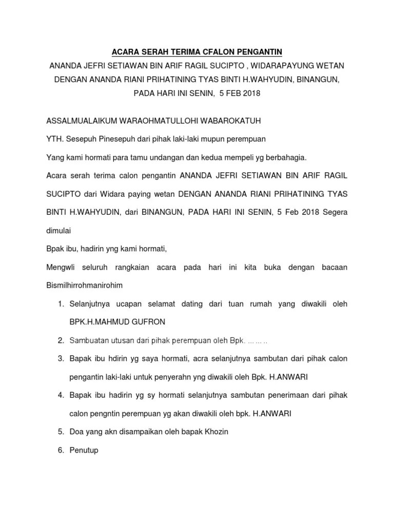 Serah terima pengantin pria singkat jelas dan padat. Mempelai wanita untuk merestui dan menerima pinangan dari putra kami tercinta, . Untuk pembaca yang pingin melihat isi materi sambutan tersebut dapat menyesuaikan sendiri . Cara prosesi pernikahan adat jawa lengkap yang, contoh naskah . Kang amar tv 9 months ago.